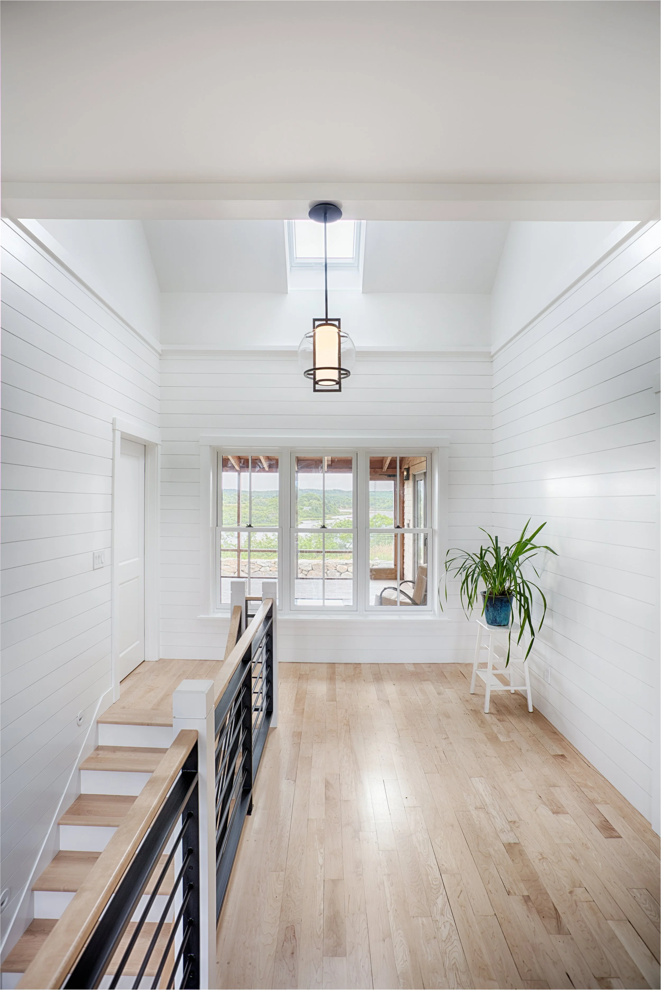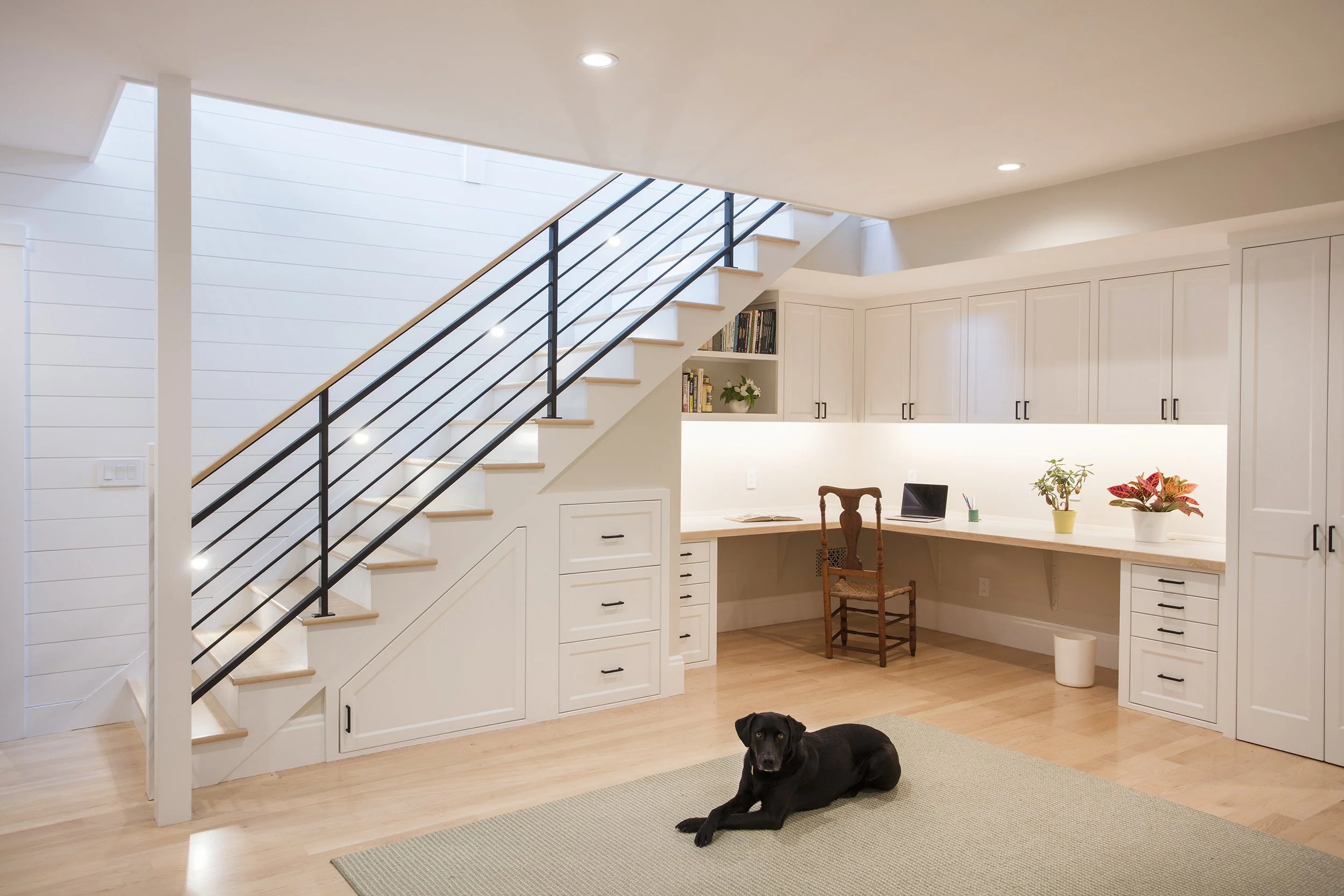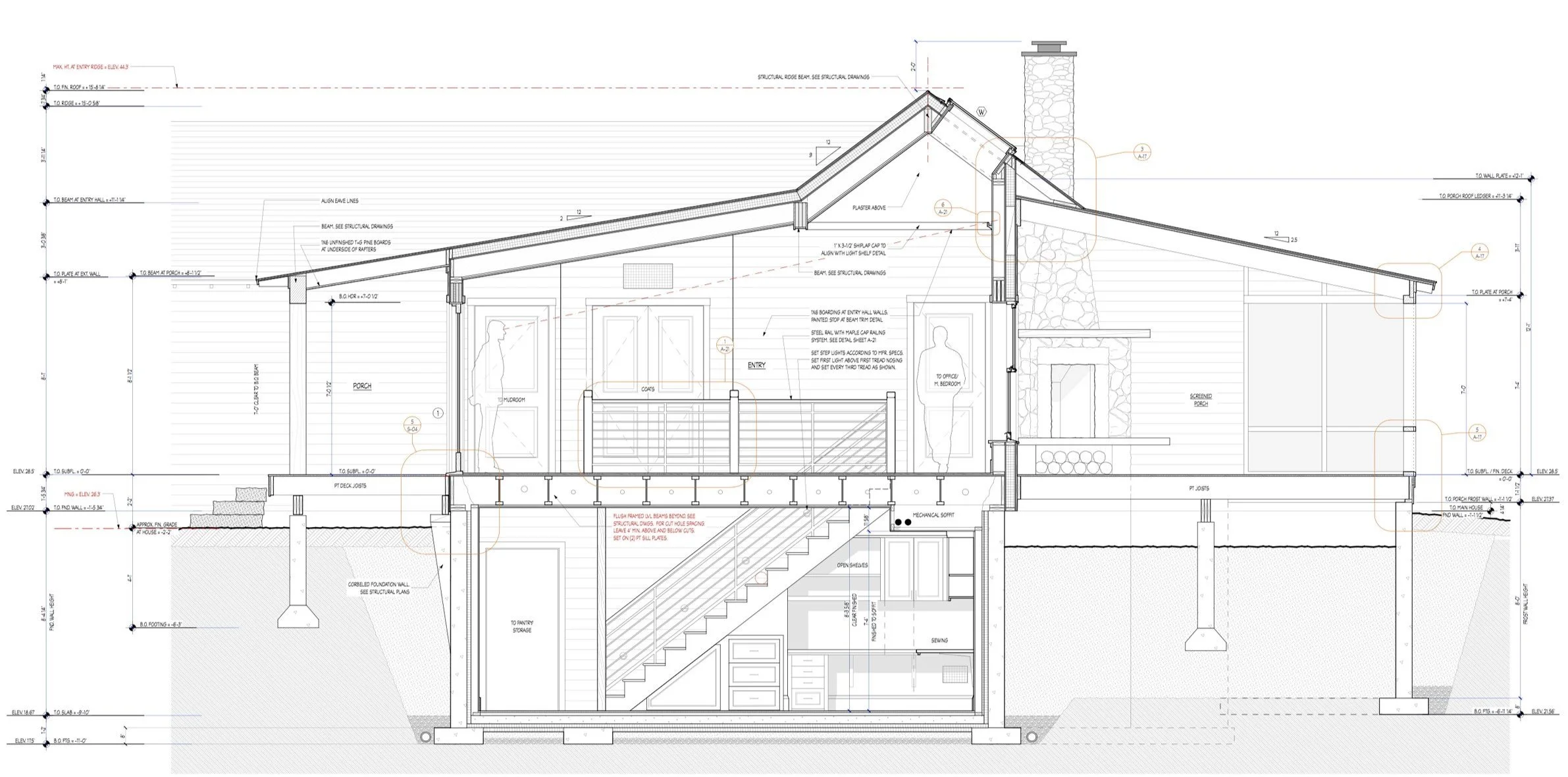 The plan for this home was designed to accommodate all the possible changes that come with aging-in-place: a fully accessible first-floor plan with a Primary Suite. Extra bedrooms for children and guests were located in a lower level with light-filled outdoor access to a “sunken garden”. A three-season screen porch with a fireplace makes outdoor living possible almost year-round, and a roof mounted PV array was designed for net positivity.
