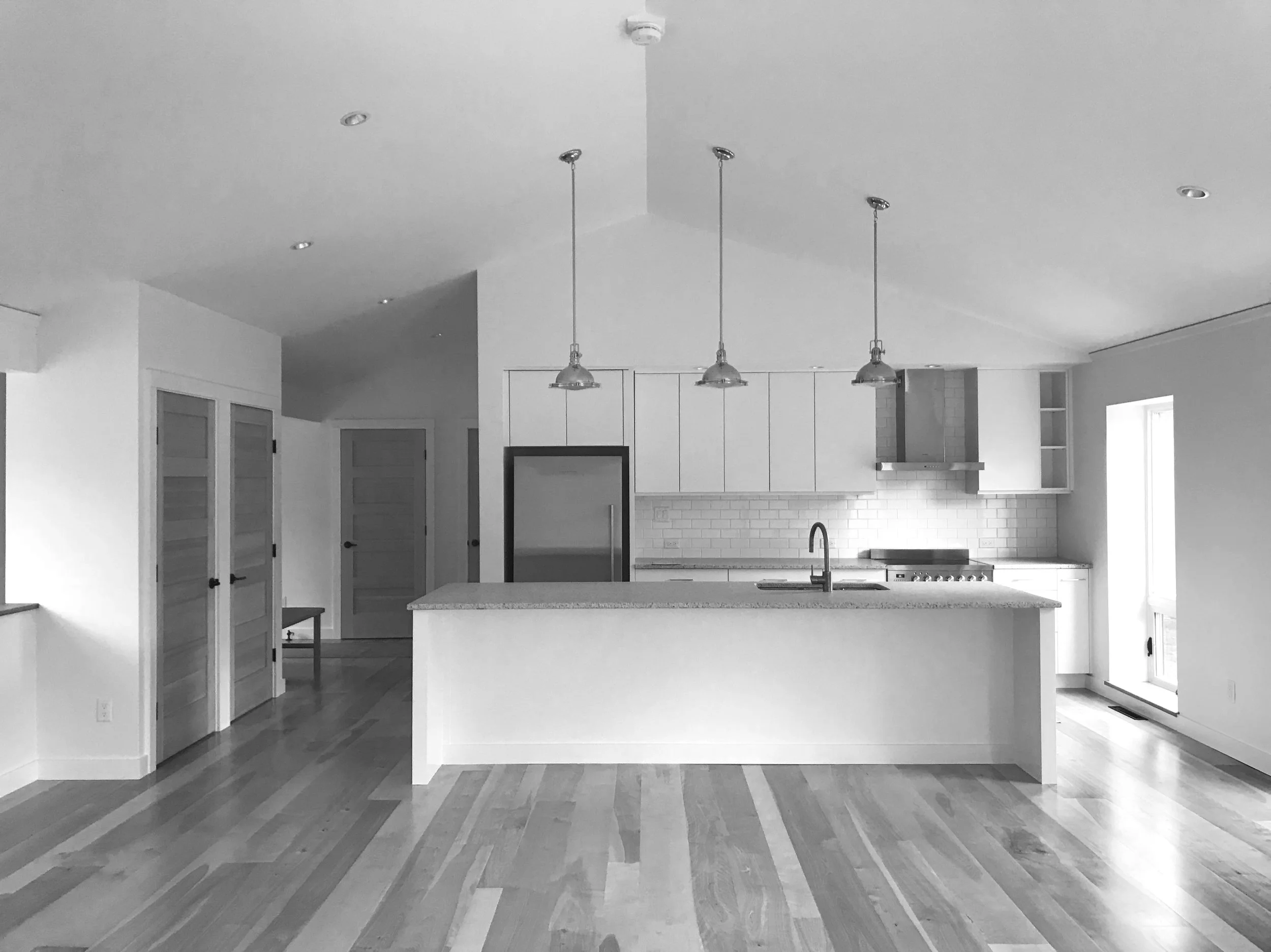 The owner of this humble and elegant home was born in the house adjacent to this site. He played in the woods as a child, as did his father, and his grandfather before that. He remembers the serenity of this place from his boyhood, which is precisely why he chose it for the location of his forever-home. A tender and reverent approach to the design was essential. Thinking deeply about the role of the built environment as an extension of the wilderness that surrounds it, the owner felt strongly about being in right relationship with his surroundings. The house is fully self-sufficient – not connected to the power grid – utilizing a roof mounted solar array and on-site battery storage. There is no infrastructure. The road in remains a winding dirt path. Since completion of construction, a new member of the family was born in the home – the 9th family member born on the land in the last 100 years.