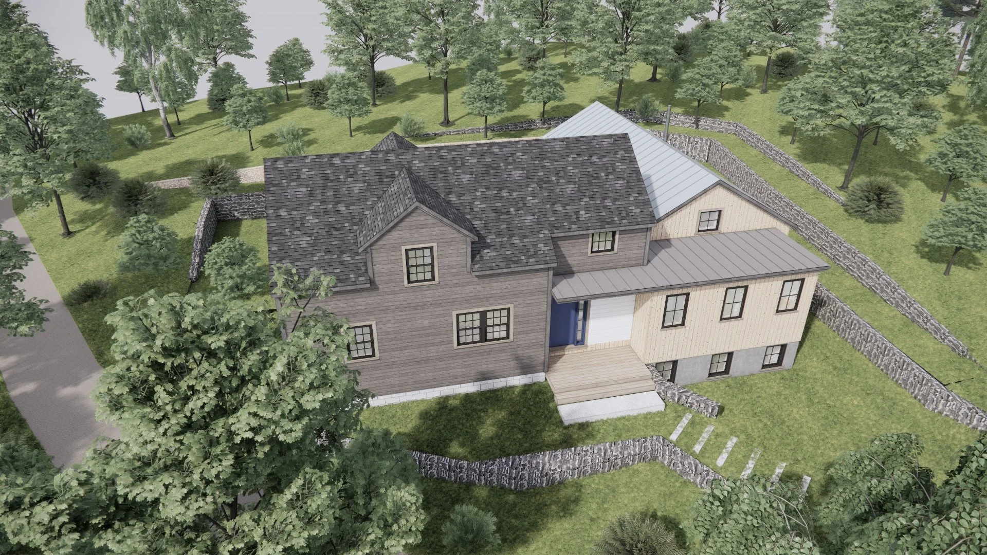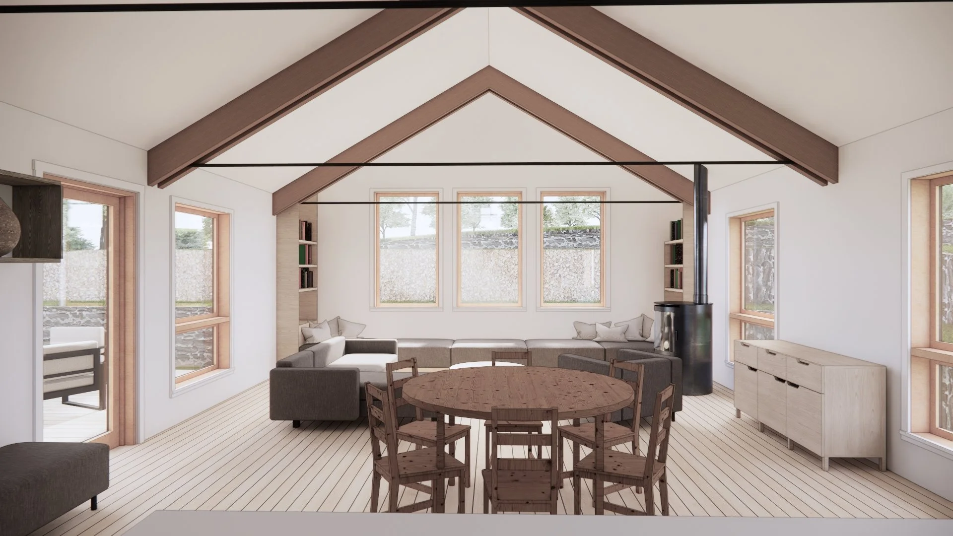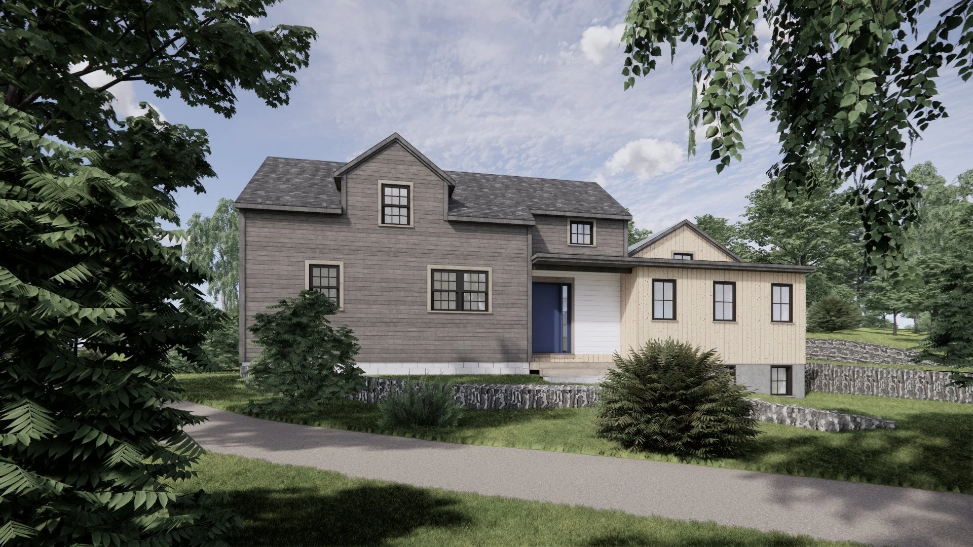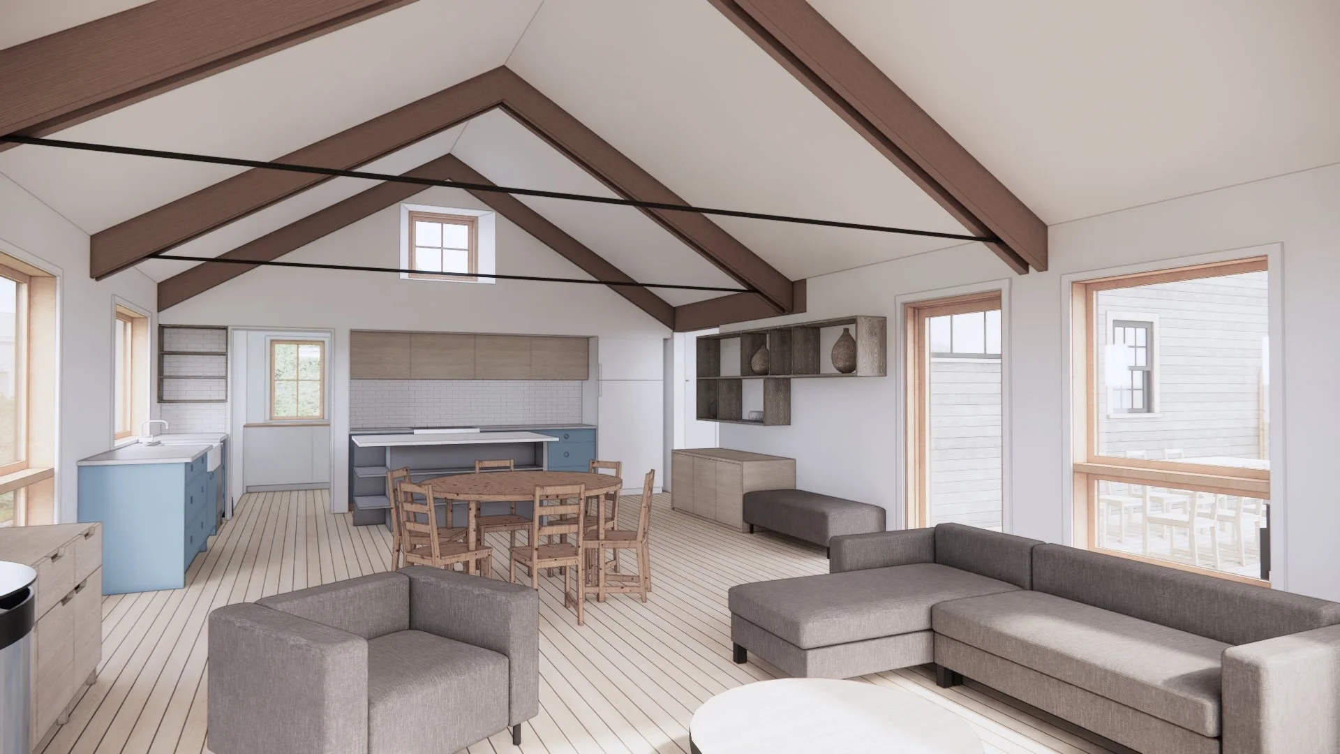 A growing island family needed more space. With two little ones and a brand-new baby, they outgrew their cozy two-bedroom apartment above the owner’s studio. The renovation and expansion of a small cottage at the back of the site will become a peaceful Primary Bedroom Suite with kids' rooms upstairs, and a bright, open addition will provide a welcoming Kitchen, Dining, and Living area. The design will host a busy household filled with children, family, and friends, with large openings framing views of the surrounding woods.